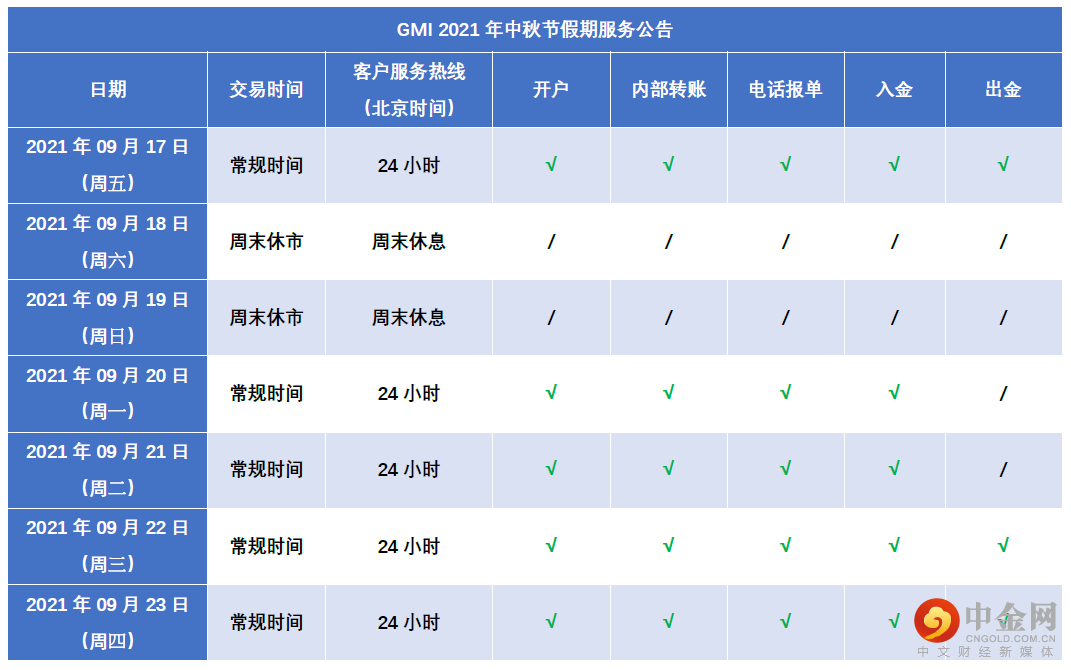 年中秋节假期将至,2021年09月19日(周日)至09月21日(周二)为法定假日,鉴于国际外汇市场在此期间仍然开放,GMI中文客服中心仍将为您提供服务,但出金服务暂停,详情请见下表。