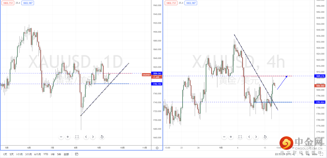 黄金天图:短期价格在回测下方水平支撑带1782.152附近起稳,并且下方有上升趋势线的支撑作用。但趋势在起稳上行后,触及上方水平压制带1806.363一带。从日内4小时级别,不宜追多行情。可适当价格调整后继续向上突破的多头机会,上方目标位置参考1825.547一带。