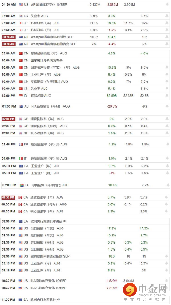 2021-09-14 01:30 AM 澳大利亚 - 商业信心指数 Aug -5,目前数据继续走弱,属于利空。2021-09-14 06:00 AM 英国 - 申请失业救济人数 Aug -58.6K,目前数据处于偏空,属于利空。2021-09-14 12:30 PM美国 - 通货膨胀率 Aug 5.3%,目前数据小幅回落,短期保持中性。
