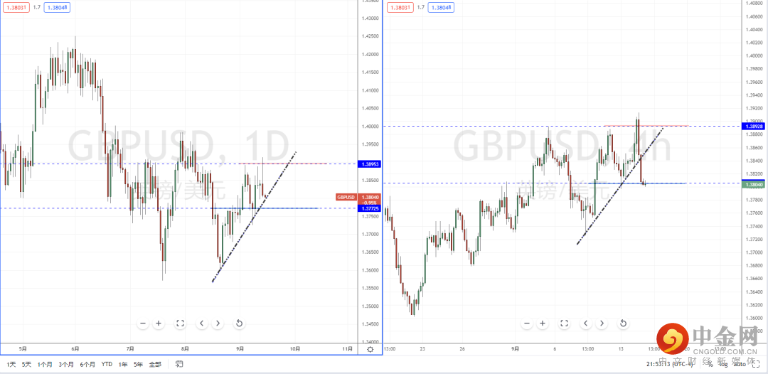 镑美天图:短期价格在冲击上方水平压制带1.38953附近后急速回落,虽然现阶段趋势处于在多头方向,并且下方有多重支撑作用。但从日内4小时级别,价格也正处于关键支撑区域。如果破位将转势为空,可关注价格在此阶段的收线表现。