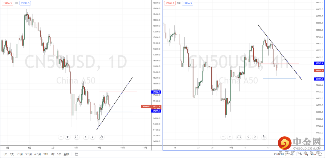 A50指数天图:目前趋势在冲击上方水平压制带15708.9附近受阻回测,虽然整体趋势趋于偏多,但需要注意价格测试下方多重支撑带附近起稳后的表现。从日内4小时级别,价格在破位后正处于测试下方支撑带15085.3一带。可关注价格在此区间收线,如果起稳将继续保持多头方向。反之,则可能继续走弱下行。
