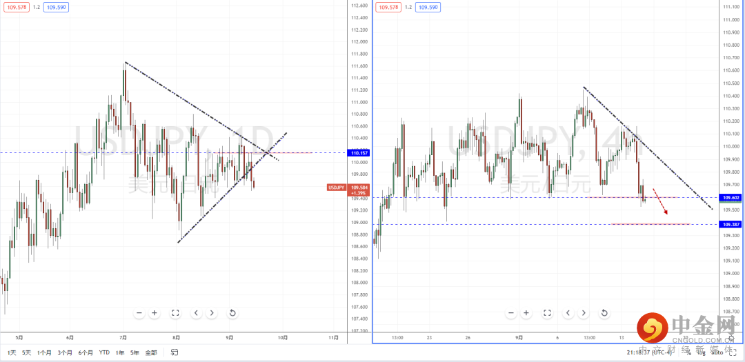 美日天图:目前趋势在象限节点附近,最终破位下行。在跌破上升趋势线后,也打开下方空头空间。现阶段趋势处于空头方向,从日内4小时级别,价格在有效跌破水平支撑带109.719附近。可适当关注价格小幅调整后继续向下走弱的空头机会,下方目标位置参考109.387一带。
