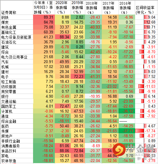如表所示,作为周期股,钢铁、煤炭在近几年都是不受人待见的“冷门股”。2016年至2020年5年间,这两个板块的整体表现都较为劣势。