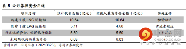 公司拟使用募集资金购建1艘LNG运输船及1艘LPG运输船,分别由子公司和谐船运及前进者船运负责。募投项目达产将进一步提升公司的货物运输效率,降低整体经营成本,实现更大的装货量及更快的运输速度,促进盈利能力提升。