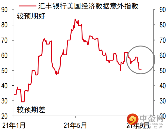 最近美国的新冠肺炎疫情比较严重(图1),美联储认为这是一个近期下行风险。事实上,美国经济的增长势头正在放缓。汇丰美国经济数据意外指数最近出现下降(图2),原因在于美国部分重要经济数据低于预期,包括7月零售销售和8月非农就业数据。所有这些因素都助长了美联储可能推迟缩减资产购买(简称“缩购”)的观点。