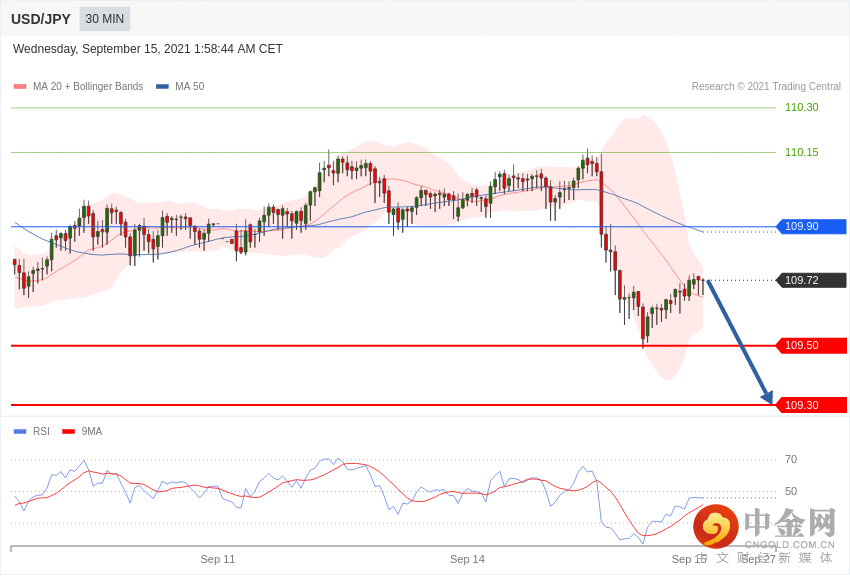 | 技术点评 | 只要109.90阻力位不被突破,向下跌破109.50位置的风险很高。 |