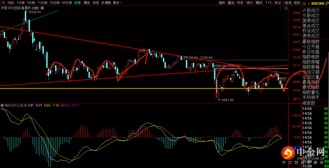 沪深300目前的走势跟前期的盘整走势十分类似,目前虽然还没有出现明显的止跌信号,但从前期支撑位看在4784之下的时间大多数是比较短暂的,届时短期可以考虑逢低进行布局。