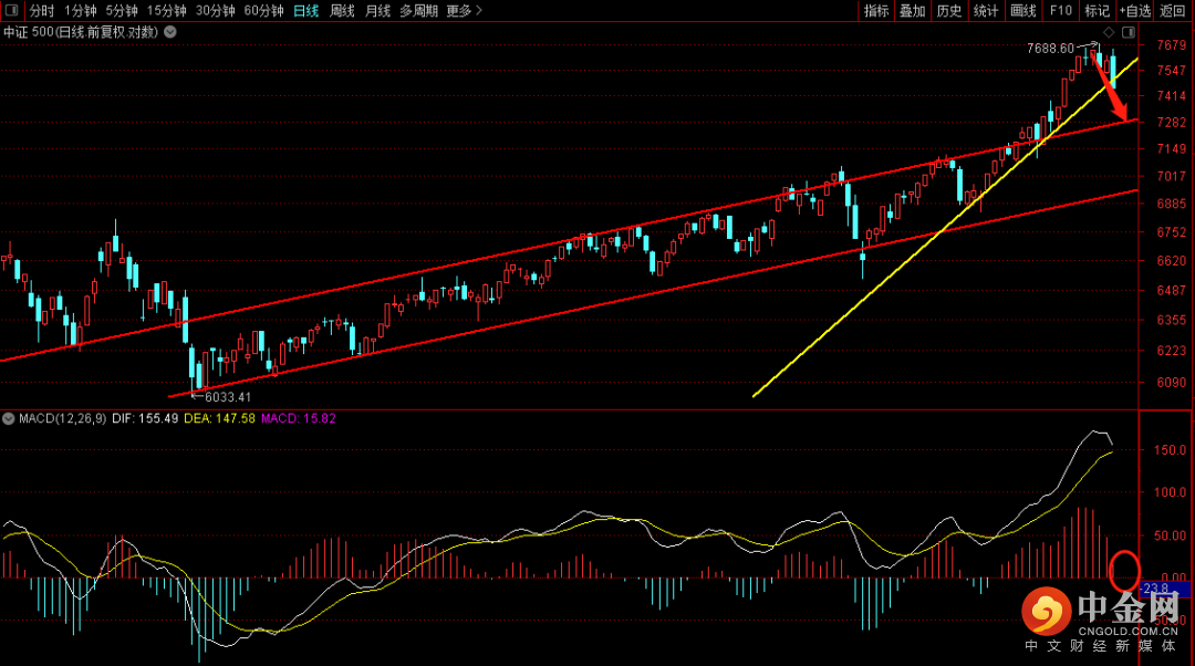 中证500跌破了快速上升趋势线,短期大概率会回落到前期上升趋势通道上轨。短期需要注意再次冲高的减仓机会,在后续一段时间大概率会维持震荡调整走势。