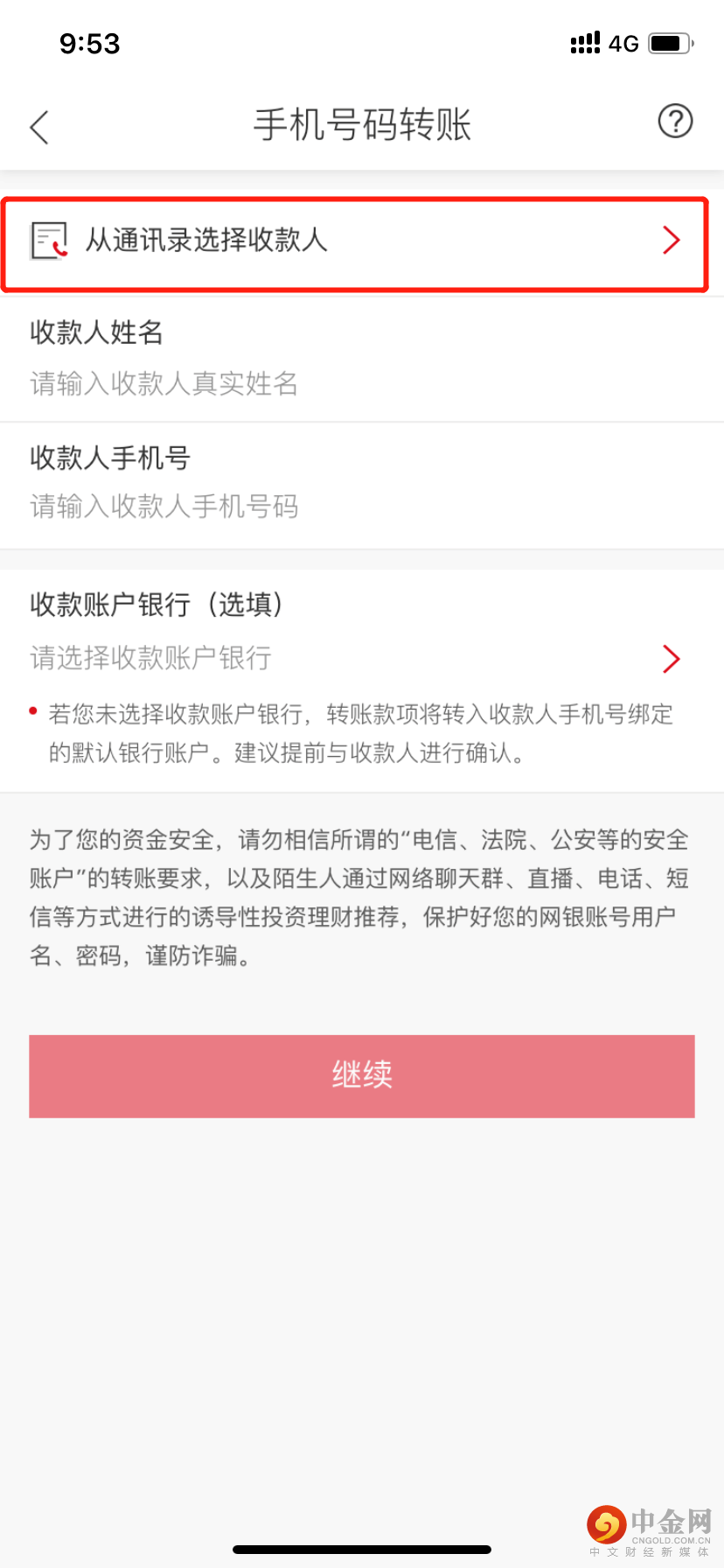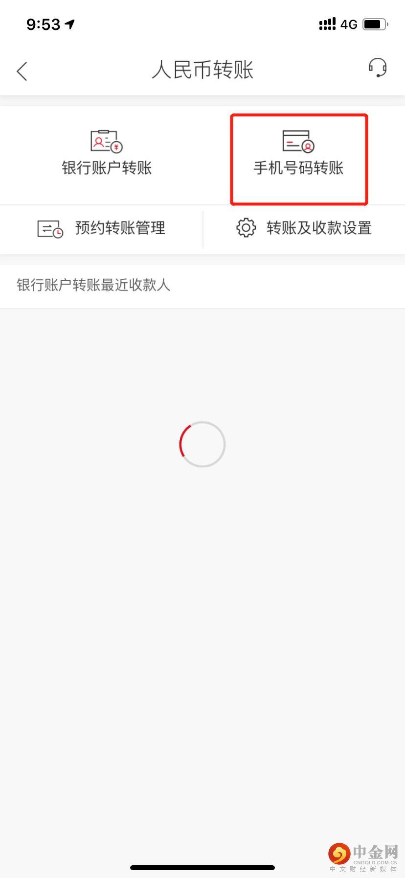 登陆手机银行,进入【人民币转账】->【手机号码转账】进入手机号码转账流程(可通过通讯录直接调取,也可输入姓名和手机号):