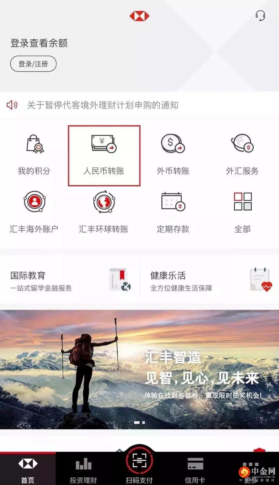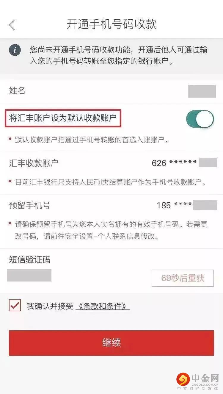 登陆手机银行,进入【人民币转账】->【转账及收款设置】->【手机号码收款设置】进入手机号码收款注册、绑定流程,并可将汇丰账户设为默认收款账户: