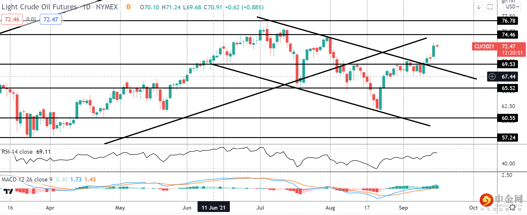 原油价格的持续上涨使市场突破了熊市通道顶部和 69.53 水平。由于 MACD 和 RSI 都看涨,短期内的焦点是进一步上行。然而,市场正在快速接近 74.46 水平的关键技术阻力区域,我们也将重新测试突破的看涨趋势线。