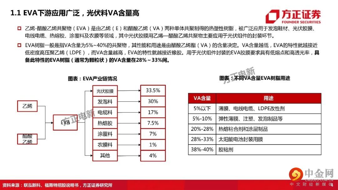 光伏胶膜是EVA重要应用领域。乙烯-醋酸乙烯共聚物(EVA)是由乙烯(E)和醋酸乙烯(VA)两种单体共聚制得的热塑性树脂,被广泛应用于发泡鞋材、光伏胶膜、电线电缆、热熔胶、涂覆料及农膜等领域,用于光伏组件封装的EVA胶膜要求具有低熔点和高透光率,具备此特性的EVA树脂的VA含量在28%-33%间。