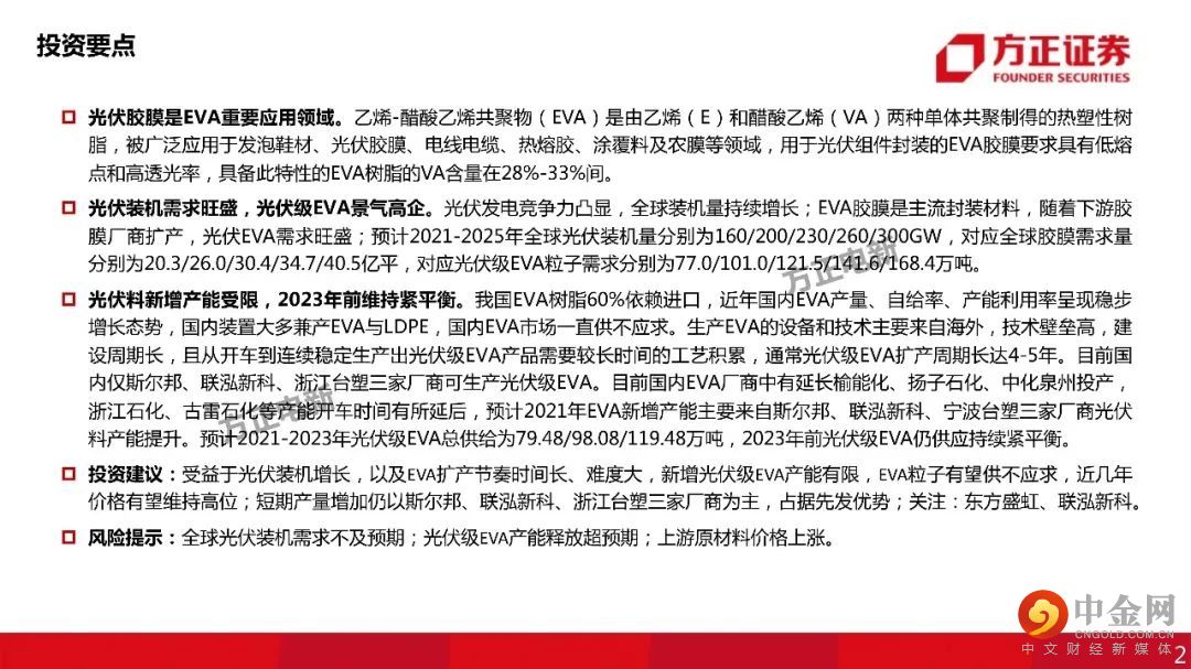 投资建议:受益于光伏装机增长,以及EVA扩产节奏时间长、难度大,新增光伏级EVA产能有限,EVA粒子有望供不应求,近几年价格有望维持高位;短期产量增加仍以斯尔邦、联泓新科、浙江台塑三家厂商为主,占据先发优势;关注:东方盛虹、联泓新科。