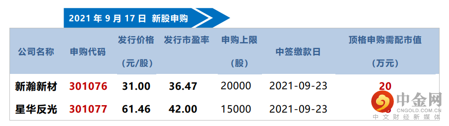股票简称:星华反光股票代码:301077申购代码:301077发行价格:61.46元/ 股发行市盈率:42.00顶格申购上限:15,000股顶格申购需配市值:15.00万元(深)申购时间:2021-09-17缴款时间:2021-09-23公司简介:反光材料、反光服饰及其他反光制品的研发、设计、生产及销售。
