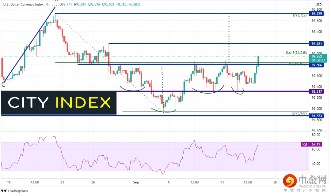 过去一年半的大部分时间里,好消息利多美元。这次也不例外,因其提升对FOMC下周宣布缩表的预期。美元大涨势头本就贯穿整个欧洲时段,在零售销售发布之后延续涨势。美元指数4小时图站上前高点,似将收上当前K线92.80,那是头肩底形态(拥有两个右肩)的颈线以及8月20日高点到9月3日低点的50%回档位。
