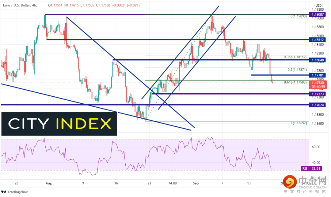 随着美元指数大涨,欧元/美元不出所料下跌(欧元构成美元指数57.6%的权重)。周四,该货币对4小时图击穿多个重要支撑位,其中有8月20日低点到9月3日高点的50%和61.8%回档位。若欲继续下探8月20日低点,首先必须攻克水平支撑位1.1727和1.1702。RSI正逼近超卖位,价格可能准备好盘中反弹。上档水平阻力位先后落在1.1770和1.1804。