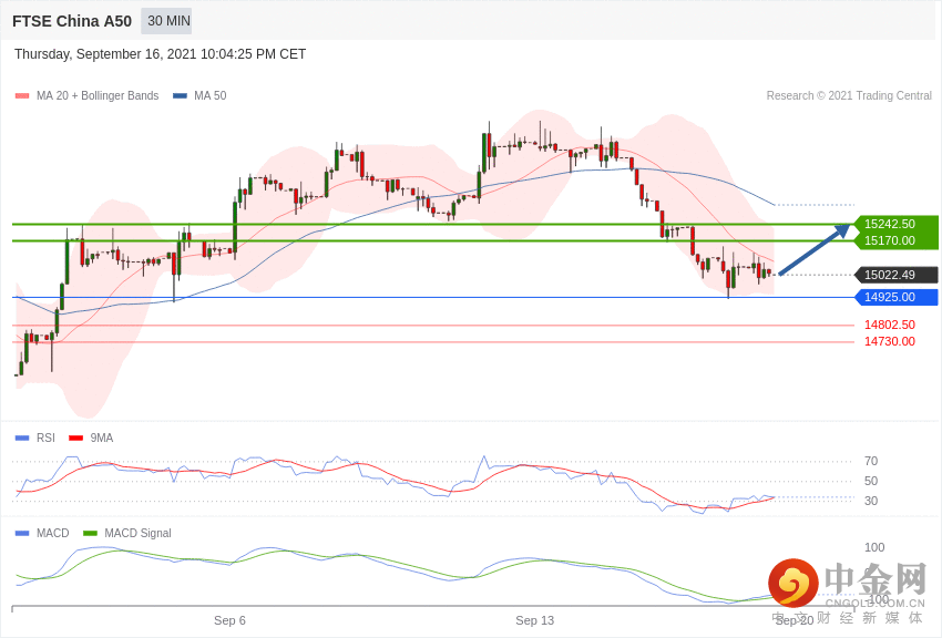 | 如跌破 14925 ,FTSE China A50 index 目标方向定在 14802.50 和 14730 。 | |