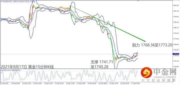 日级别线图,长阴烛跌破近一个月盘整支撑,1780美元形成反压,可能延续跌势;15分钟K线,短线形成盘跌,下降趋势线冲不过,大有可能下探支撑。