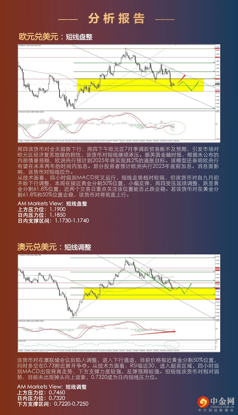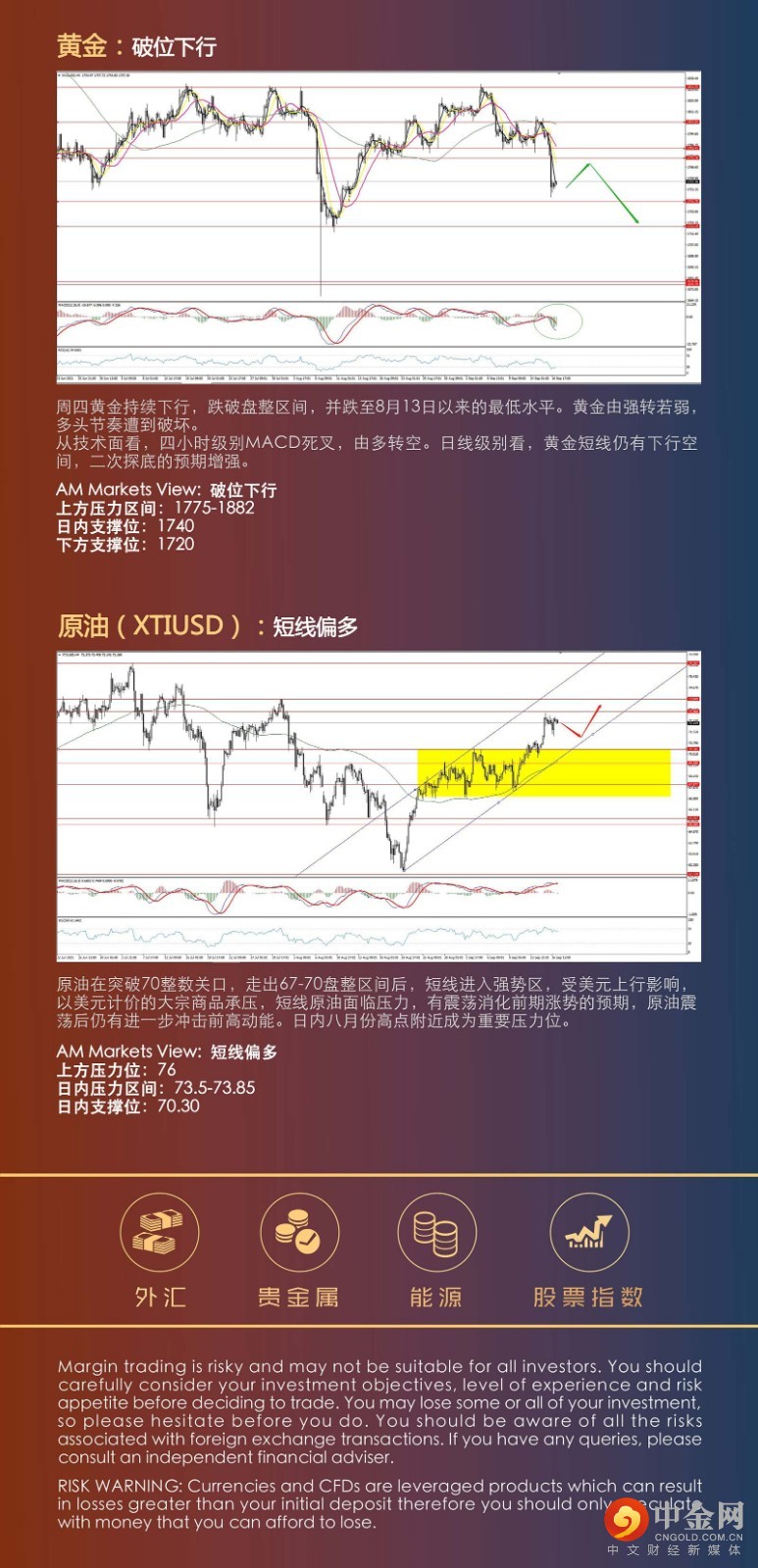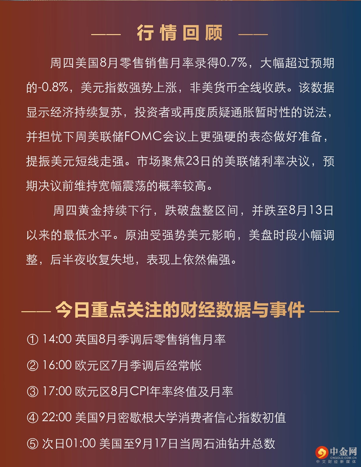 周四美国8月零售销售月率录得0.7%,大幅超过预期的-0.8%,美元指数强势上涨,非美货币全线收跌。该数据显示经济持续复苏,投资者或再度质疑通胀暂时性的说法,并担忧下周美联储FOMC会议上更强硬的表态做好准备,提振美元短线走强。市场聚焦23日的美联储利率决议,预期决议前维持宽幅震荡的概率较高。 周四黄金持续下行,跌破盘整区间,并跌至8月13日以来的最低水平。原油受强势美元影响,美盘时段小幅调整,后半夜收复失地,表现上依然偏强。