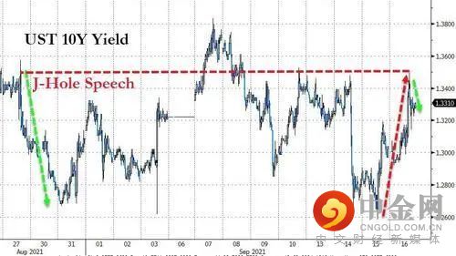 美国10年期基准国债收益率自欧股盘前重上1.30%后总体上行,在美股早盘曾升破1.35%,刷新上周五以来本周四日盘中高位,触及鲍威尔在杰克逊霍尔央行年会讲话当日的水平,到美股收盘时处1.33%上方,日内涨约4个基点。