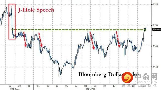 到周四美股收盘时,美元指数处于92.80上方报92.842,日内涨逾0.3%;彭博美元现货指数涨0.4%,盘中逼近1150点,也创鲍威尔在杰克逊霍尔央行年会上讲话将近三周来新高。