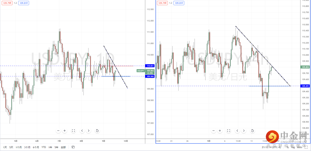 美日天图:目前行情在跌破水平支撑带后再次起稳上行反弹,虽然上方有下降趋势线的压制作用,以及水平压制带在110.021附近。但从日内4小时级别,价格现阶段已经触及下降趋势线附近。如果承压受阻,将继续下行。反之,则继续保持反弹态势。
