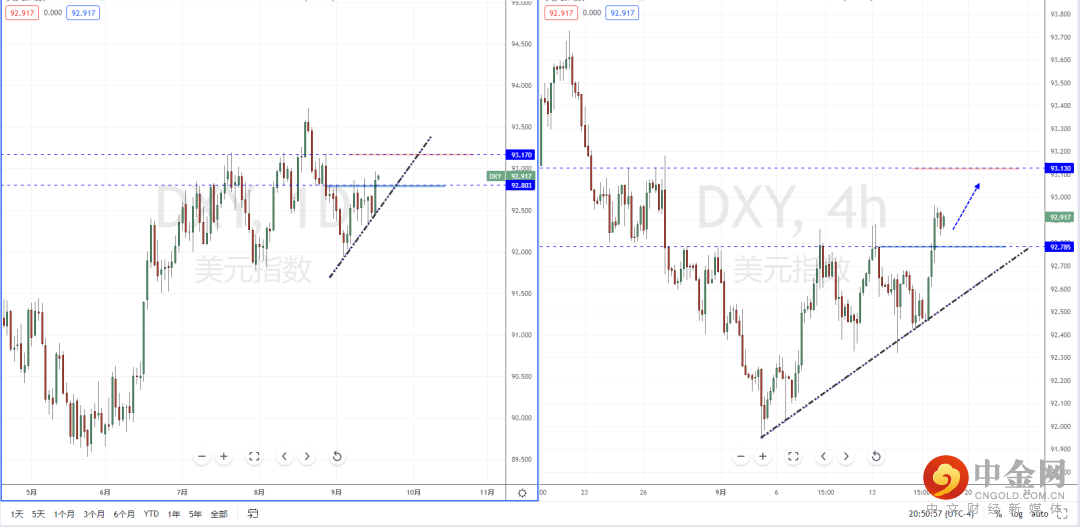 美元指数天图:短期价格在横盘区间调整后坚决上行突破水平压制带92.803附近,并且打开上方多头空间。整体趋势依然处于在多头阶段中,下方有上升趋势线的支撑作用。从日内4小时级别,价格在突破后进入小幅调整。可适当关注价格回测支撑后再次上行机会,上方区间目标位置参考93.130附近。