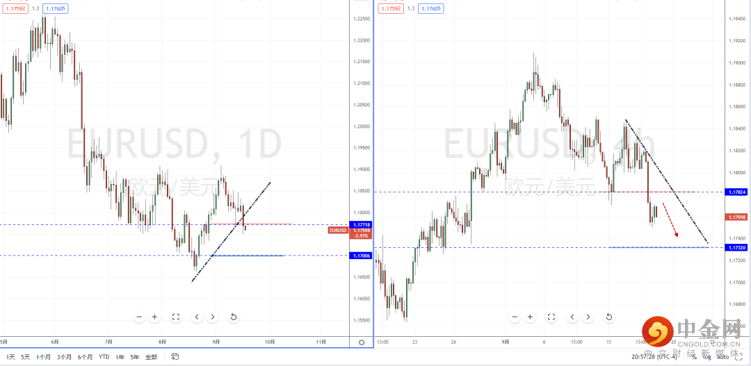 欧美天图:目前行情因美元指数坚决上行,使得欧美在在关键位置继续向下破位。并且价格有效跌破水平支撑带1.17718一带,以及上升趋势线的支撑作用。从日内4小时级别,可适当关注价格调整后继续走弱的空头机会,下方目标位置参考1.17320附近。