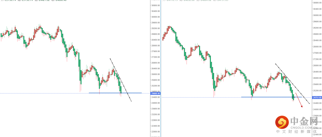 恒生指数天图:目前行情继续处于在空头阶段中个,上方有下降趋势线的压制作用,但短期价格已经触及前期关键支撑带附近,不宜追空行情。从日内4小时级别,可适当关注价格调整后继续走弱的空头机会,下方目标位置参考周线前期低点附近。