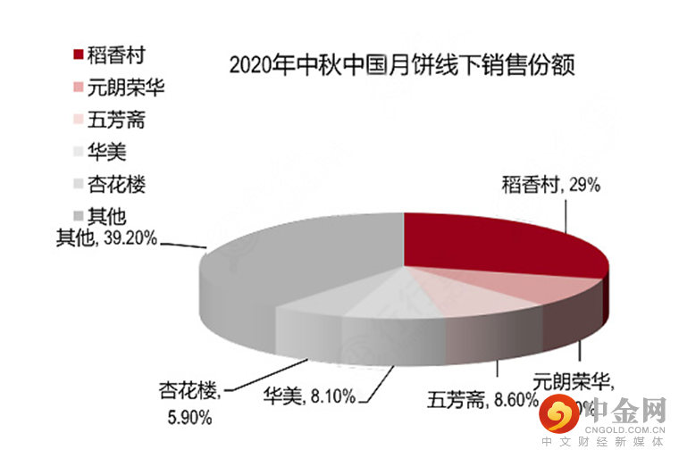 数据显示,2020年中秋节期间,苏州稻香村、华美、五芳斋、广州酒家和杏花楼线上销售份额位列前五。