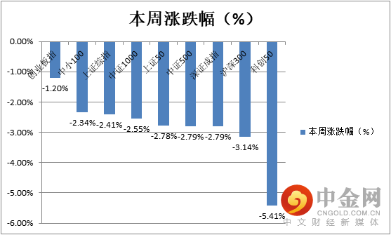 本周各大指数悉数收跌,其中科创50指数大跌超5%。创业板指由于周五的出色表现,最终收跌1.20%,在主要指数中跌幅最小。(见图1)