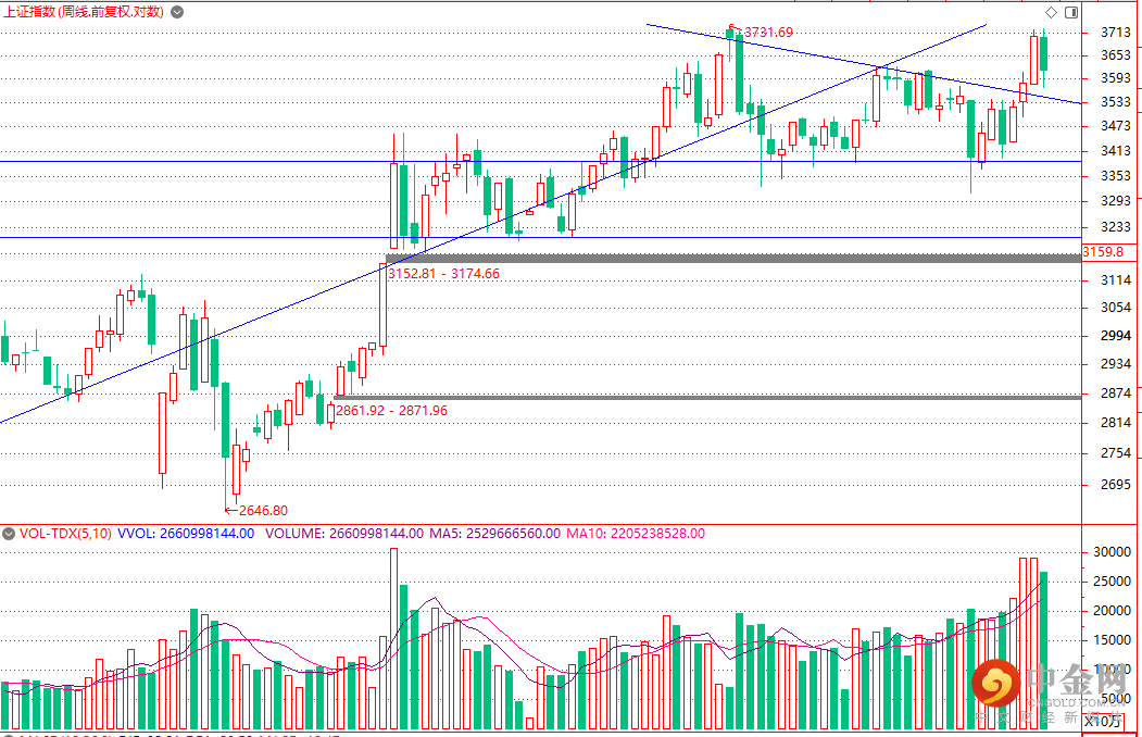 首先,我们先看看上证指数周K线走势。