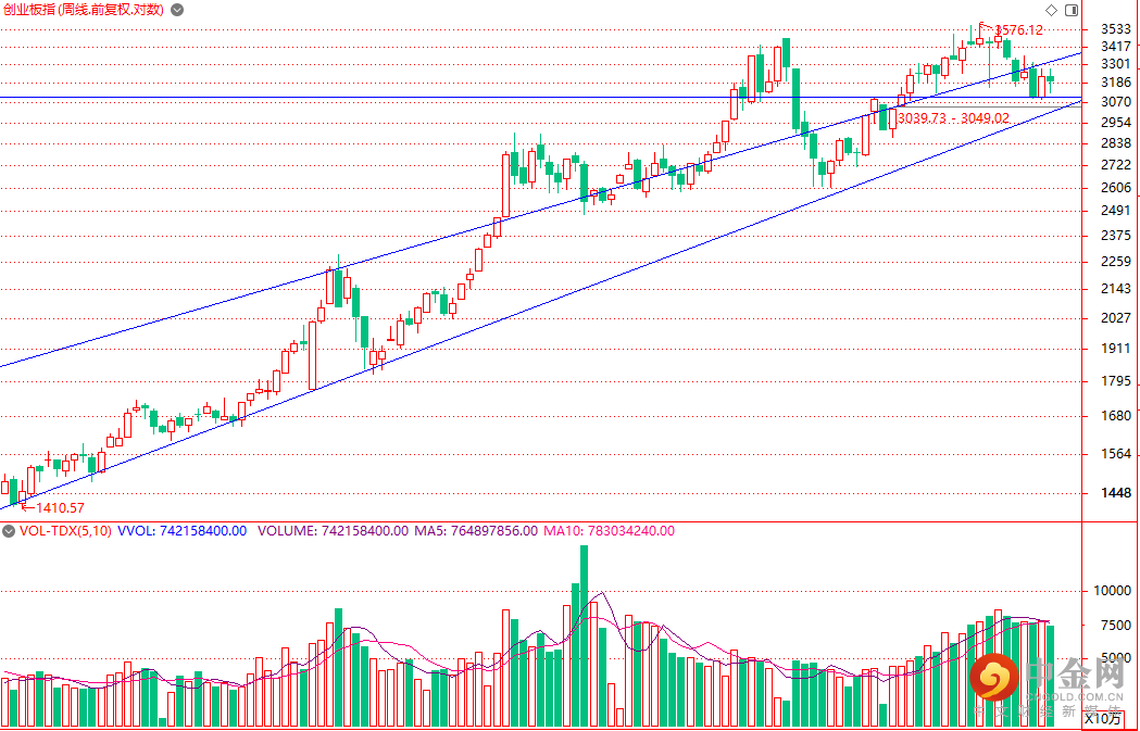 然后,我们看看创业板指数周K线走势。