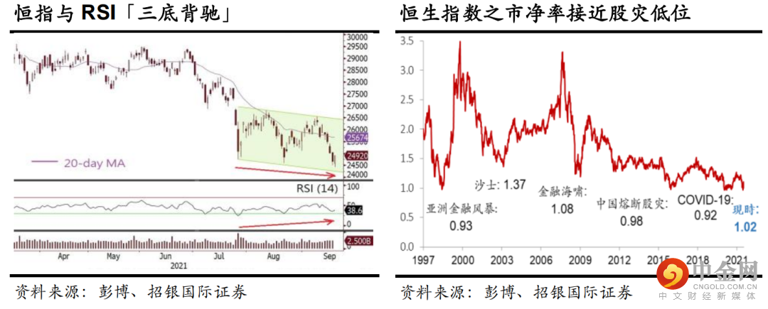 恒指估值近谷底,短线反弹上望20天线。我们认为,恒指之估值已接近过往股灾低位。我们于9月份策略报告分析,恒指之经调整21年预测市盈率约9.6倍(剔除近一年多才获纳入指数的高估值增长股),贴近十年低位。市净率现时亦仅得1.02倍,与过去四分一世纪之多个股灾低位相差不远。图表上,恒指上周四与14天RSI出现「三底背驰」见底讯号后,随即反弹,假如短期内没有更多令人意外的监管政策消息,相信恒指可进一步反弹,初步目标20天平均线约25,660,较乐观望目标于下降通道顶部约26,300。