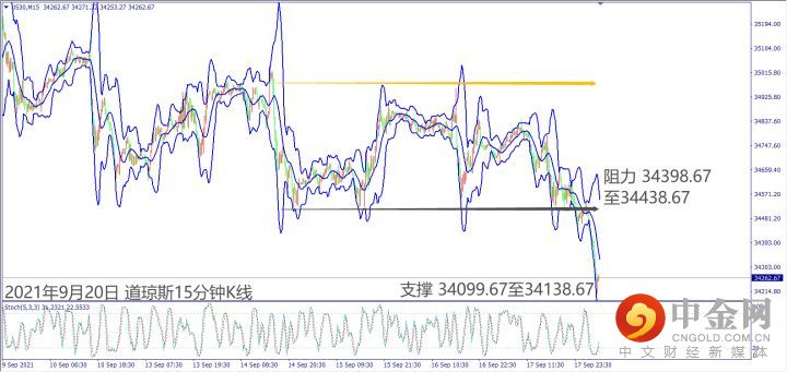 周末美国众议院预算委员会主席称拜登经济议程的审批可能推迟到10月初,造成道琼斯和纳指皆创下波段新低。今天(20日)美国国会若宣布债务上限延迟至10月投票,道琼斯小时布林带中轨34,580反压,建议可偏空操作。纳指圆形顶反转后KD出现死叉,小时布林带中轨15,368反压,建议可偏空操作。