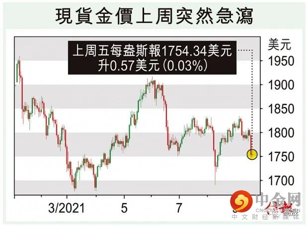 上周金市早段仍维持在1780元(美元.下同)水平之上,且曾反弹至1808.6元,但至此乏力再升。上周四听闻美国零售销售数据强劲,强化了对联储局减购债的憧憬,金价大幅下泻到1745.3元,周末收报1754.34元,为今年4月初以来的最低每周收市价。
