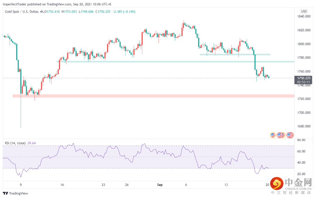 4小时图中,黄金在击穿1785的重要平台支撑后空头动能进一步释放,RSI指标的短期超卖亦难以支撑起黄金目前脆弱的走势。RSI指标有微微的背离趋势,但有效信号并未释放,目前空方稍占优势。