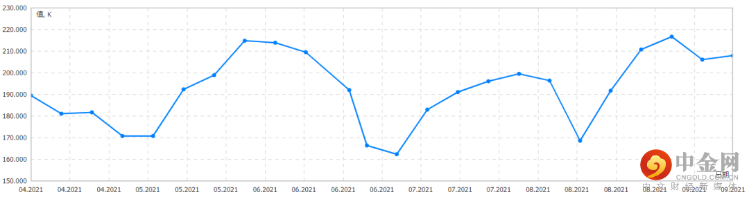 截至9月14日当周(数据截止至9月11日),黄金期货的净多头增加了1721份合约,至207760份。