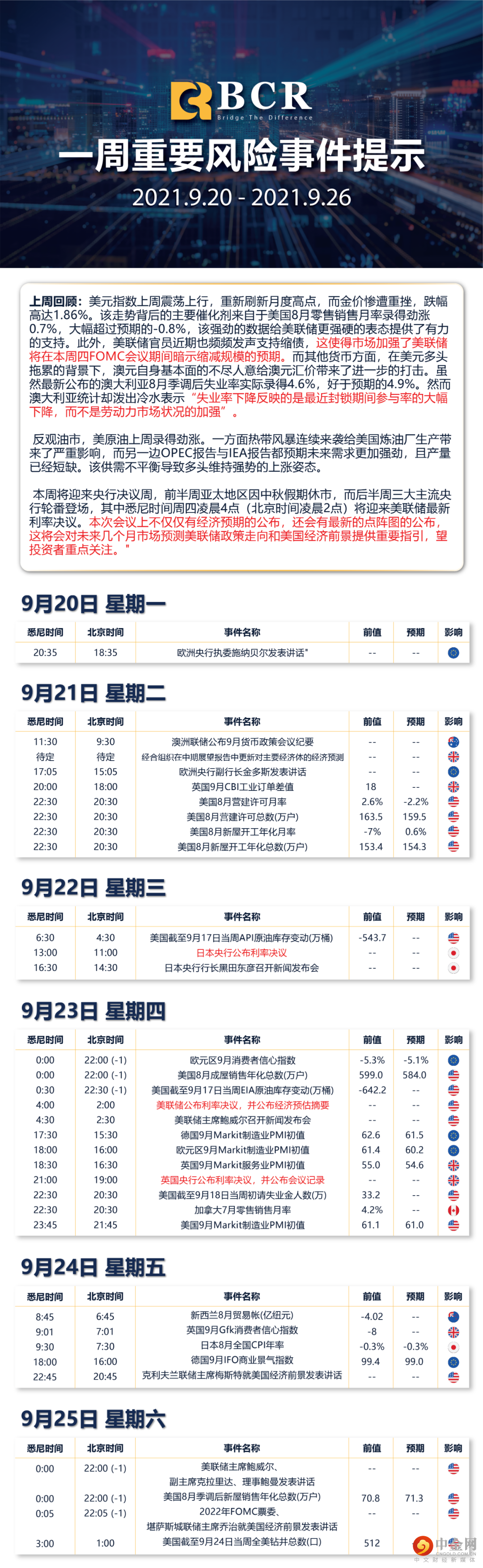 【BCR风险提示】一周重要风险事件提示 2021.9.20 - 2021.9.26