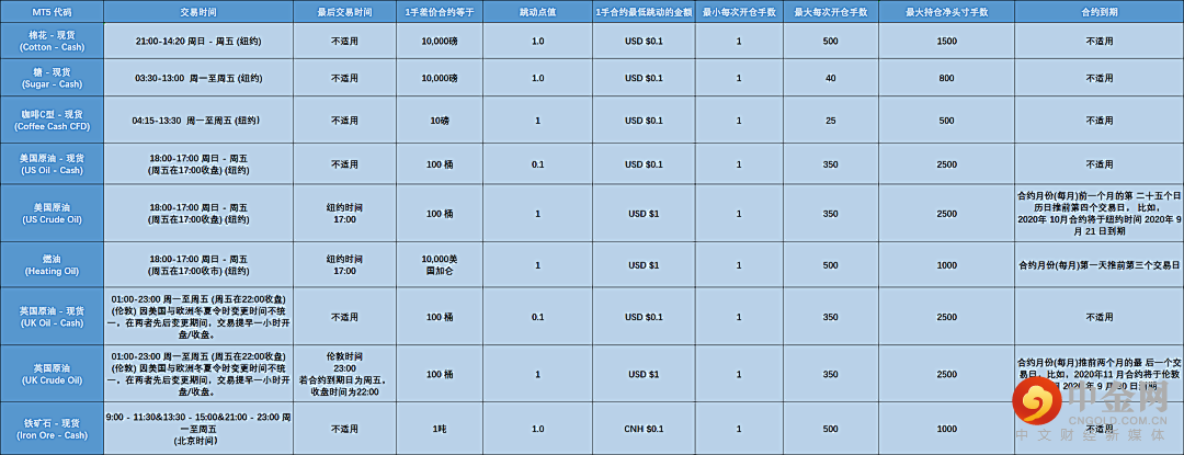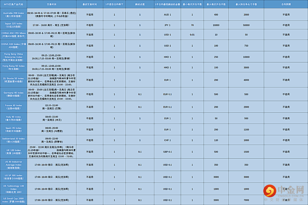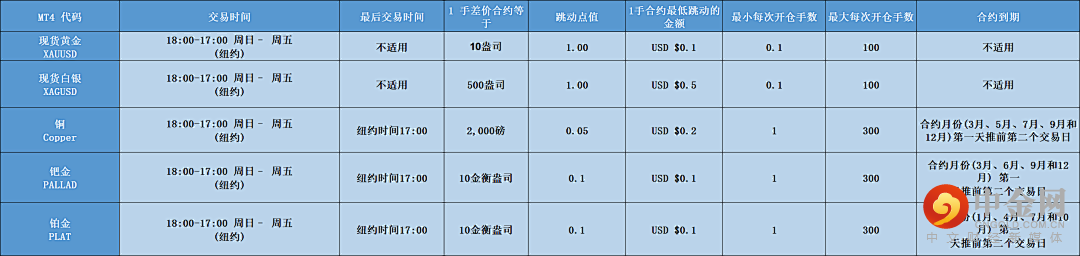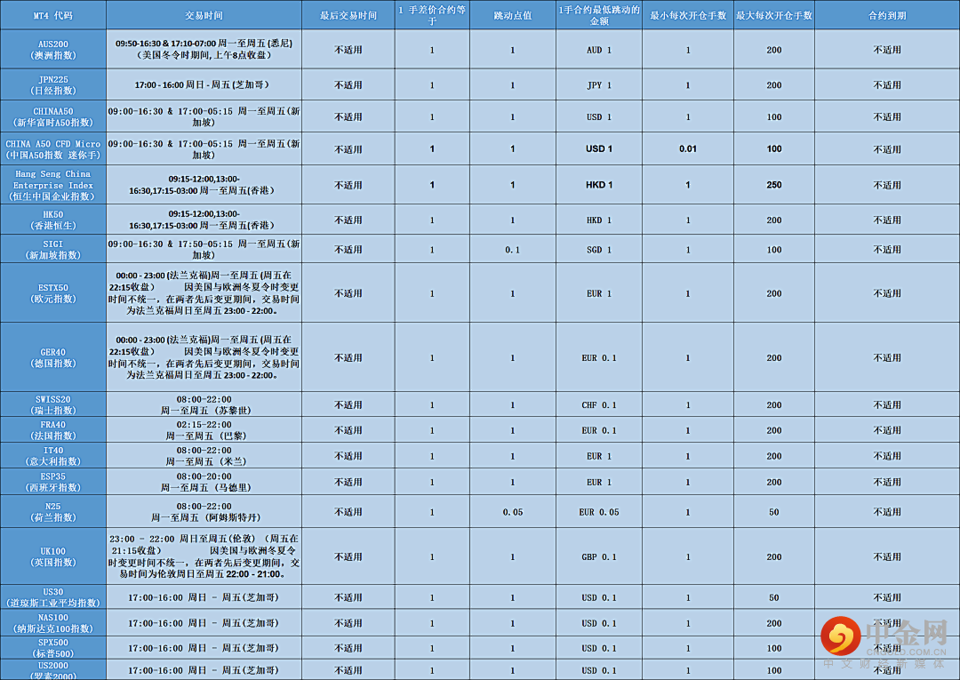 MT4平台指数左右滑动查看更多数字货币CFD(MT4平台)左右滑动查看更多股指左右滑动查看更多大宗商品左右滑动查看更多贵金属左右滑动查看更多请注意:上述表格中的信息包括交易时间仅供参考,详细的交易产品明细,请您登录交易平