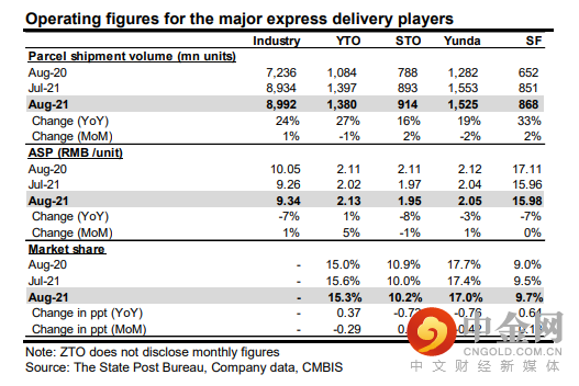 主要快递公司在周末发布了8月份的运营数据。通达系的单价格压力持续缓解。我们相信单价的改善将在今年持续,主要由于快递公司的战略从规模增长转向盈利。六家公司包括中通快递(2057 HK/ ZTO US,买入)、圆通速递(600233 CH, 未评级)、申通快递(002468 CH, 未评级)、 百世 (BEST US) 、韵达(002120 CH, 未评级)和极兔速递从9月1日开始上调派费0.1元人民币/票,以支持政府早前公布关于做好快递员群体合法权益保障工作的意见。我们认为持续多时的割喉式价格战即将结束,并将继续拉动行业反弹, 我们看好中通、圆通和韵达。