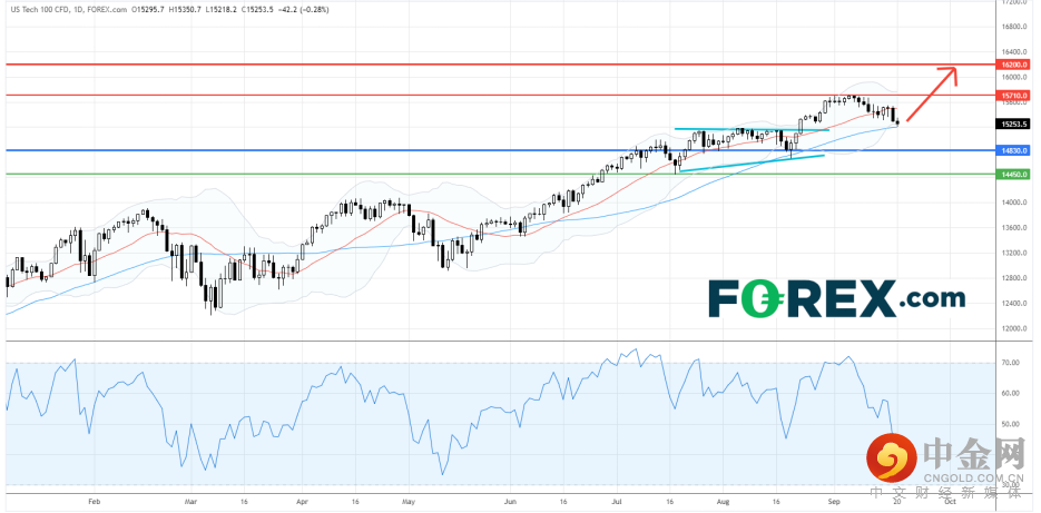 美国科技指数100指数CFD在9月初创出历史新高后回软,投资目前关注美国会否上调企业税和联储局的货币政策会议。