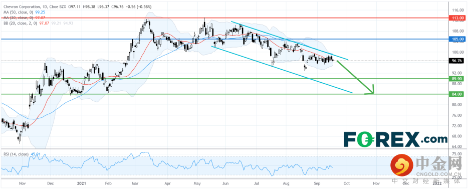 从技术角度看,如日线图所示,雪佛龙仍然维持短线的下行趋势。它在6月以来的下降通道内交投,并且受正在下降的20日及50日移动均线压制。