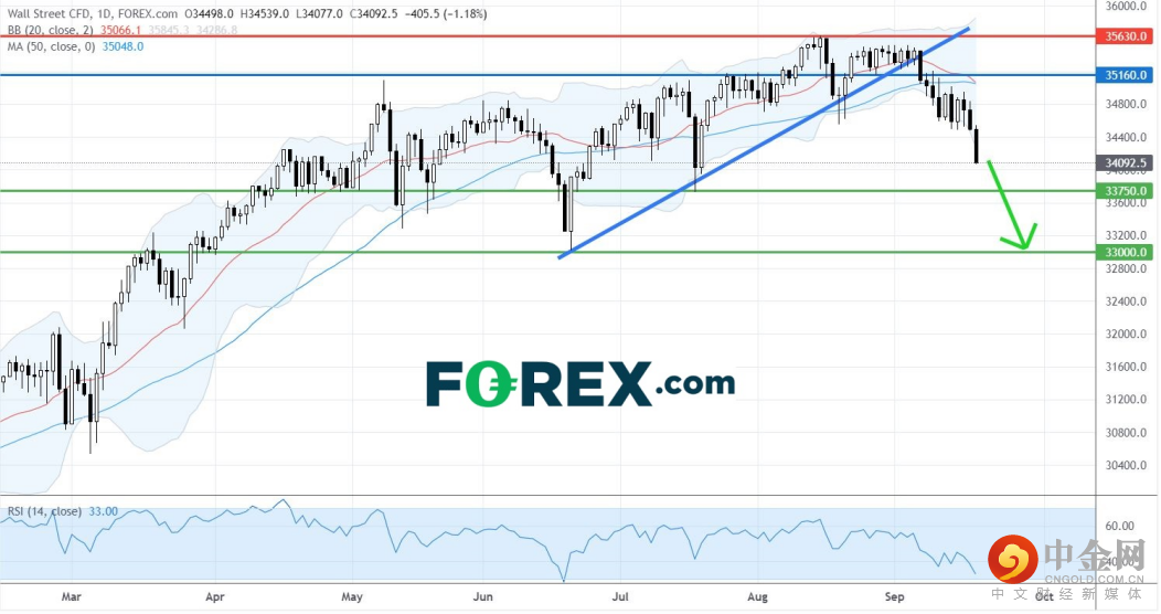 相反,若华尔街指数CFD反弹回主要阻力 (止损) 位35,160点,可反转看涨,上行目标在35,630点 (8月时创的纪录高位)。