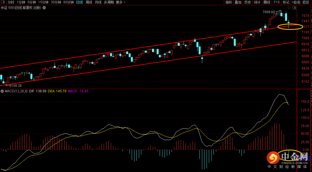 中证500向下回探前期上升趋势轨道上轨,短期重点关注这个位置是否能够出现连续三根的企稳k线,如果无法出现则可能继续向下回踩趋势下轨的支撑,而由于日线macd已经出现绿柱调整,后续大概率会持续一段时间。