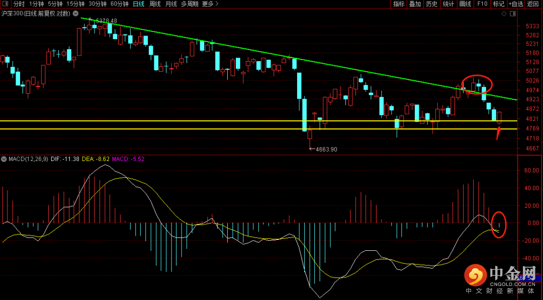 沪深300日线由于结构的变化进行了重新划分下降趋势线,短期从结构上看,在无法连续站稳上升趋势线之前,下降趋势还可能出现延续。从前期的平台看,在4769到4821下方区间的时间是短暂的,后续如果出现有向下跌破的走势,大概率也是会在短期内出现快速折返。