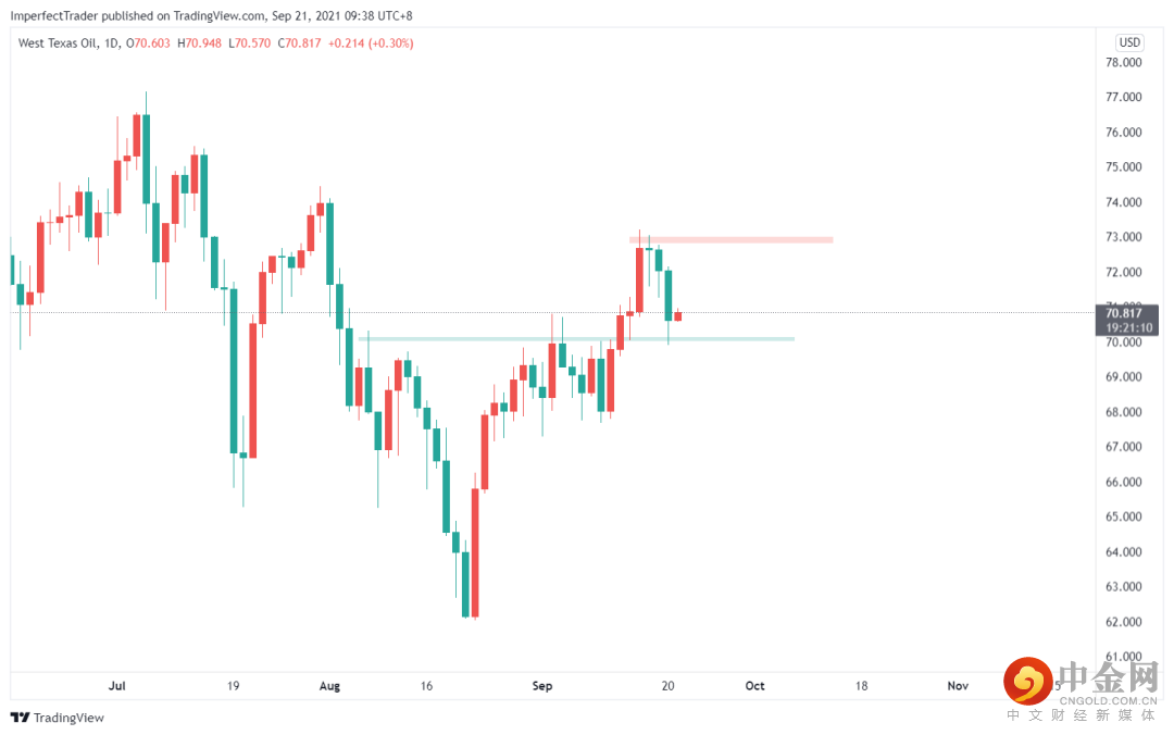 日线图中,原油同样完成回踩,下方的支撑(70美元)需要重点关注,以日线图收盘价为主要参考依据,目前多空双方较为谨慎。