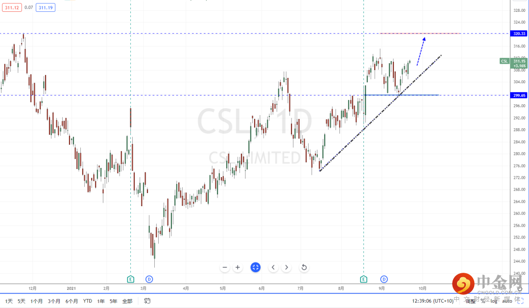 CSL:由于目前整体市场处于低迷弱势阶段,大部分产业都在相对低位徘徊。但生物科技相对较强,从CSL趋势格局表现,价格在回测下方水平支撑带299.65附近起稳,同时下方又有上升趋势线的支撑作用。短期可适当关注价格调整后继续上方的多头机会,上方区间目标位置参考320.33一带。