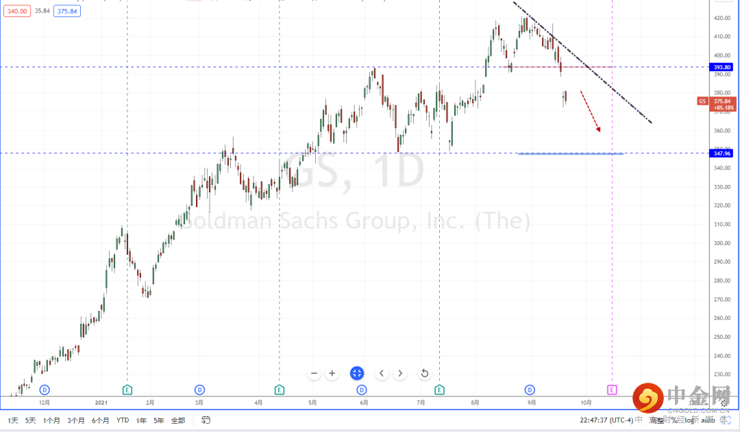 GS:在近期市场低迷阶段,多数ETF主流产业板块以及相关指数重挫,使得产业在弱势状态下,分化严重。从GS目前整体格局也处于在空头阶段中,上方有下降趋势线的压制作用,并且价格跳空向下。短期可适当关注价格调整后继续走弱的空头机会,下方区间目标位置参考347.96一带。