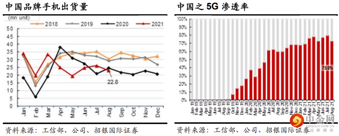 中国8月份手机出货量跌9.7%,料第四季弱势持续。中国工信部公布,8月份国内市场手机出货量同比/环比 -9.7%/-15%,其中国产品牌手机同比 -6.7%至2,281万部,外国品牌 -39%至150万部。我们认为,8月份的出货量疲弱主要由于中国之5G渗透率高(8月达73%)、缺乏吸引特点、芯片短缺和原材料成本上升,以及近期的疫情影响消费开支。展望将来,我们预期中国智能手机市场之弱势将持续至第四季,因新的旗舰型号缺乏吸引特色,以及5G替换周期已进入后段。对于国产品牌,我们预期于第四季将面对更大压力,因为定价较低的 iPhone 13 料将抢占市场份额。供应商方面,由于设备规格升级不多,我们较看好市占率上升者如比亚迪电子(285 HK, 买入) (iPad/Watch),同时对瑞声(2018 HK, 持有)和舜宇(2382 HK, 持有)维持审慎看法,因瑞声之利润率受压,而舜宇之升级放缓及现时估值合理。